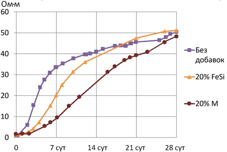 Аналогичные испытания были проведены на анализаторе коррозионной активности грунта (АКАГ), который благодаря предусмотренной защите от поляризационного эффекта позволяет определить значения электрического сопротивления при постоянном токе. Для исследований были взяты образцы без добавки, а также с включением в исходный состав 20% порошка ферросилиция и 20% магнетита.