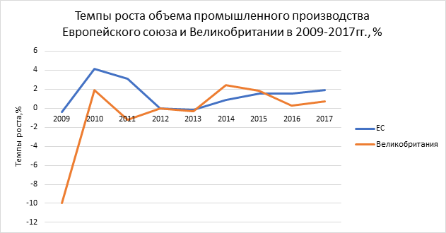 Рисунок 3. – Темпы роста объема промышленного производства ЕС и Великобритании в 2009-2017 гг. (%)