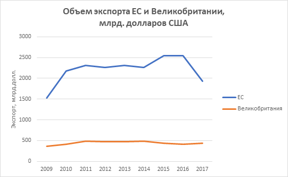 Рисунок 4. – Объем экспорта ЕС и Великобритании в 2009-2017 гг., млрд. долл. США