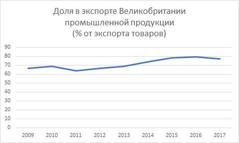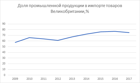 Рисунок 8. – Доля промышленной продукции в импорте товаров Великобритании в 2009-2017 гг., %