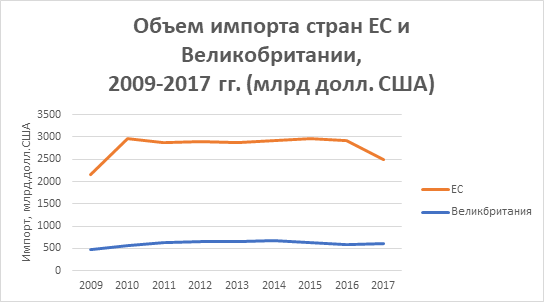 Рисунок 7. – Объем импорта ЕС и Великобритании в 2009-2017 гг., млрд. долл. США