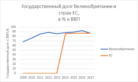 За исследуемый период 2009-2017 гг. у многих развитых стран произошел значительный рост государственного долга. Следует отметить, что у Великобритании стремительного роста государственного долга не наблюдалось. На рисунке 10 представлены данные о изменениях государственного долга к ВВП Великобритании и в целом по странам Евросоюза за период 2009-2017 гг.