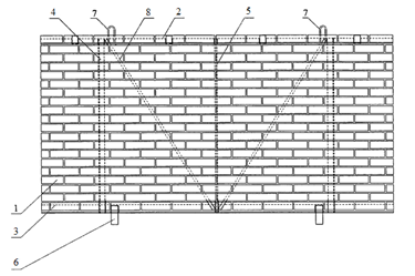 Рис.5. Модуль для ремонта фасада здания: 1 – кирпичная кладка; 2 – верхний горизонтальный уголок; 3 – нижний горизонтальный уголок; 4, 5 – вертикальные стойки; 6 – пластина-фиксатор; 7 – крепежная петля; 8 – диагональная перемычка