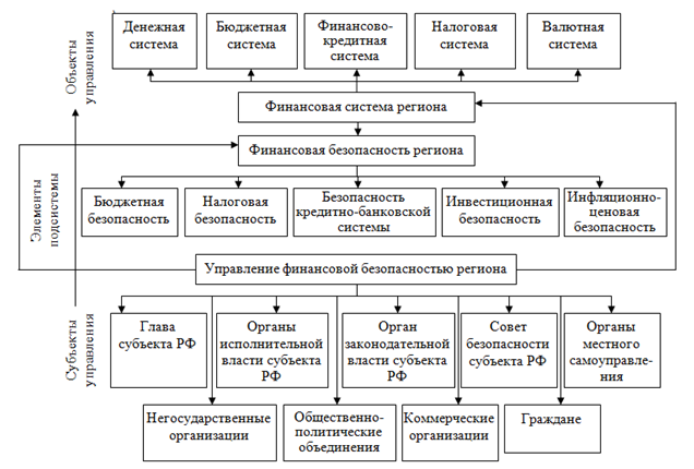 Управление экономической безопасностью в финансовой сфере региона сводится в практическом смысле его осуществления в реализации комплекса мер, применении методов и инструментария, направленного на защиту экономических интересов элементов финансовой системы и участников финансово-экономических отношений, действующих в региональном территориальном пространстве. Полноправными субъектами системы управления помимо федеральных и региональных органов власти являются органы местного самоуправления, также как два вышестоящих уровня управления, поддерживающие финансовые отношения в реальной экономике и формирование бюджетов.