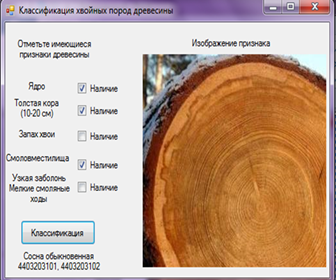 Разработка программного продукта заключается в создании банка признаков однородной группы товаров, их интерпретации в соответствии с положениями ТН ВЭД и внесении в программную оболочку с возможностью визуализации. Окно интерфейса с рекомендациями идентифицируемых пород круглых лесоматериалов (рис. 2) позволяет эффективно использовать программный продукт при фактическом контроле круглых лесоматериалов.