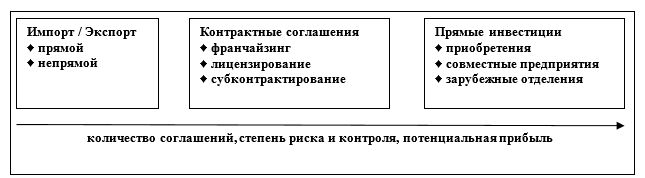 На рисунке 3 представлены три стратегии выхода на зарубежный рынок, а также возможности, присущие каждой из этих стратегий. Как видно из рисунка, каждая последующая стратегия связана не только с большими обязательствами и риском, но и с большим контролем и потенциальными доходами.