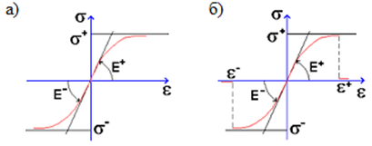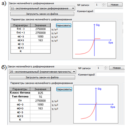 Рис. 1. Законы деформации материалов: а) значения характеристик задаются вручную; б) автоматически в программном комплексе