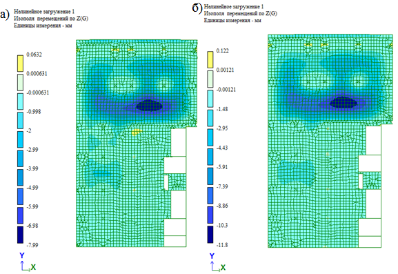 Рис. 4. Прогибы плиты перекрытия: а) модель 1; б) модель 2