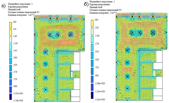 Выполнено исследование картины разрушений по верхнему и нижнему слою плиты перекрытия. На рис. 5 и 6 показаны направления развития трещин на фоне изополей главных напряжений.