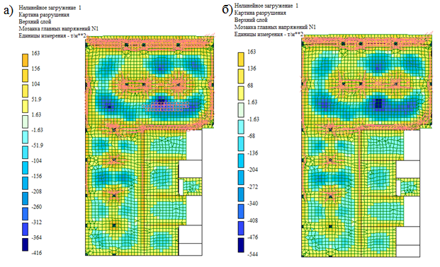 Анализ изолиний главных напряжений позволяет сделать вывод, что напряжения в верхнем слое одинаковы для первого и второго варианта расчетных моделей. Напряжения в нижнем слое плиты перекрытия по второй схеме увеличились на 31 % при автоматическом учете нелинейных свойств бетона.
