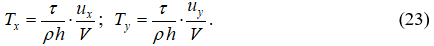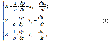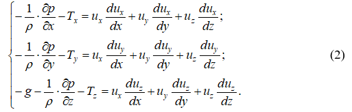 где X, Y, Z – компоненты объёмных сил; Tx, Ty, Tz – компоненты сил сопротивления, отнесённых к единице массы жидкости; r – плотность жидкости; p – местное давление; ux, uy, uz – компоненты вектора местной скорости.