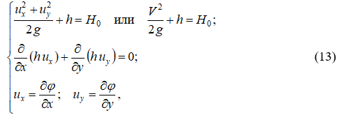 Согласно уравнениям (13), (15) систему движений двухмерных в плане потенциальных водных потоков можно записать в виде: