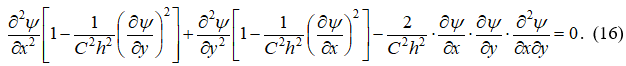 Это уравнение по внешнему виду совпадает с уравнением для потенциала скорости плоского безвихревого газа, причём скорости звука соответствует волновая скорость C.