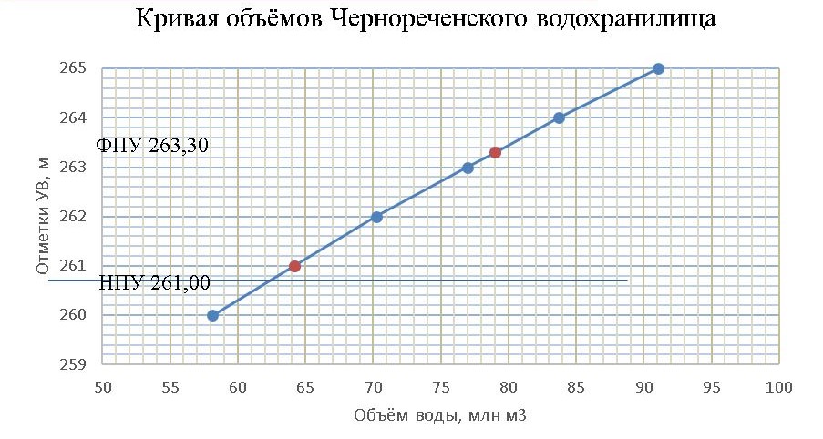 В данных расчётах водохранилище характеризуется «батиграфическими кривыми» (рис. 1), из которых устанавливается ёмкость форсировки (трансформации) расходов воды и глубина слоя форсировки: Vф = WФПУWНПУ = 81,0 – 64,2 = 16,8 млн. м3;  hф = 263,30 – 261,00 = 2,30 м.