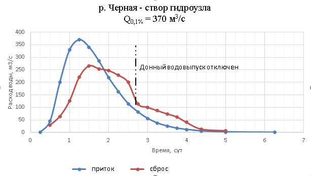 Рис.4. Гидрографы притока и сброса паводка в створе Чернореченского гидроузла существующими водосбросными сооружениями