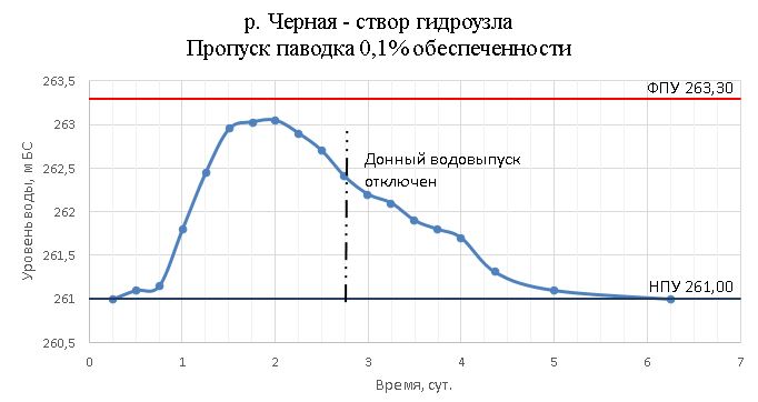 Результат расчёта показывает, что даже при столь глубокой сработке уровня (до отметки 256,40 м БС) возможно переполнение водохранилища от отметки ФПУ на 0,1 м (до отметки 263,4 м БС). Период стояния максимальных уровней составляет 0,5 суток. При таком режиме возможно ещё избежать катастрофических последствий.