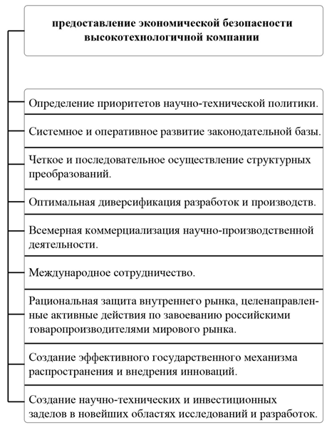 Ведущими экономистами утверждается, что для того, чтобы со стороны России была предоставлена экономическая безопасность высокотехнологичных производств, необходим перечень специальных задач и меры по их разрешению. (рисунок 1) [3].