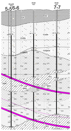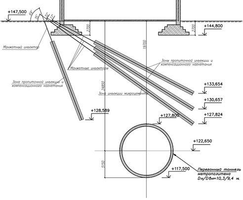 При проходке тоннеля диаметров 10,3 метра под промышленным цехом возникла необходимость снижения расчетной дополнительной осадки. Цех представляет из себя здание с полным железобетонным каркасом. Категория технического состояния здания в целом характеризуется согласно ГОСТ 31937-2011 - как «работоспособное», а согласно Приложения Д СП 22.13330.2016 «Основания зданий и сооружений» - II «удовлетворительное». Следовательно, предельная дополнительная осадка данного здания составляет 3,0 см, а относительная разность осадок- 0,001. В ходе предварительных расчетов было обнаружено, что расчетная дополнительная осадка здания превышает нормативную, в связи с чем было принято решение о проведении компенсационного нагнетания в основании фундаментов здания. При этом перебор грунта задавался равным 1,8% по всей длине тоннеля. В связи с тем, что описываемое здание находится в плотной городской застройке, отсутствует возможность устройства технического котлована для проведения горизонтального бурения для инъекторов, поэтому для проведения компенсационного нагнетания была выбрана схема, показанная на рисунке 2. Такая схема позволяет нагнетать суспензию в основание фундаментов и не требует дополнительных работ по откопке котлована для горизонтального бурения. Однако такая схема несколько снижает эффективность компенсационного нагнетания, в связи с чем требует большего расхода суспензии.