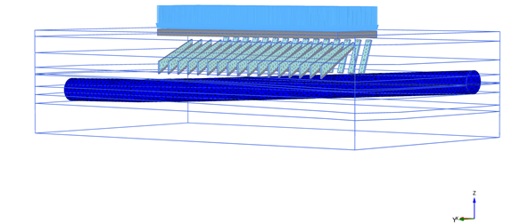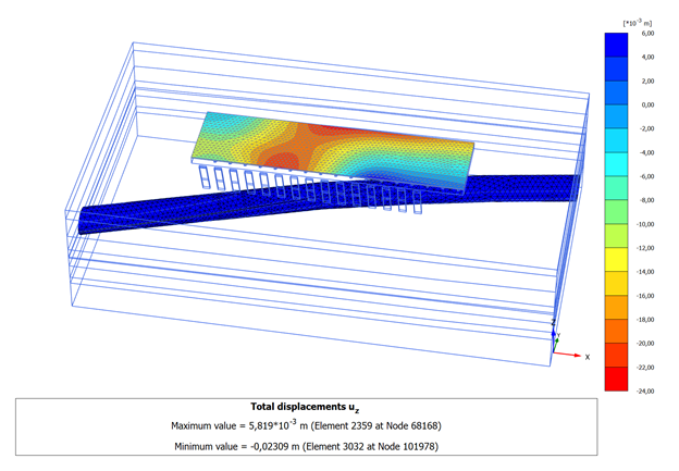 При расчете НДС системы «фундамент- компенсационный слой- тоннель» необходимо также учитывать взаимное расположение здания и тоннеля в плане, а также изменение глубины тоннеля относительно фундаментов здания. В том случае, если взаимное расположение тоннеля и здания как в плане, так и на разрезе можно принять параллельным, то для корректного расчета НДС системы можно считать достаточным двухмерный расчет сечения. Однако в данном случае следует производить расчет по нескольким сечениям, чтобы оценить влияние изменения геологических условий на расчетную осадку здания. В том случае, когда взаимное расположение здания и тоннеля отличается от параллельного, следует использовать пространственную постановку задачи.