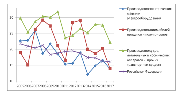 Высокотехнологичное импортозамещение требует осуществления соответствующих инвестиционных вложений. Анализ динамики относительных значений инвестиций, направленных на реконструкцию и модернизацию (фактически – на развитие), в общем объеме инвестиций в основной капитал в высокотехнологичных видах производства (автомобилестроение, авиастроение, судостроение, энергомашиностроение и т.д.), представленных на рис. 1 – свидетельствует о снижении пропорций данного типа вложений в российском производственном секторе.