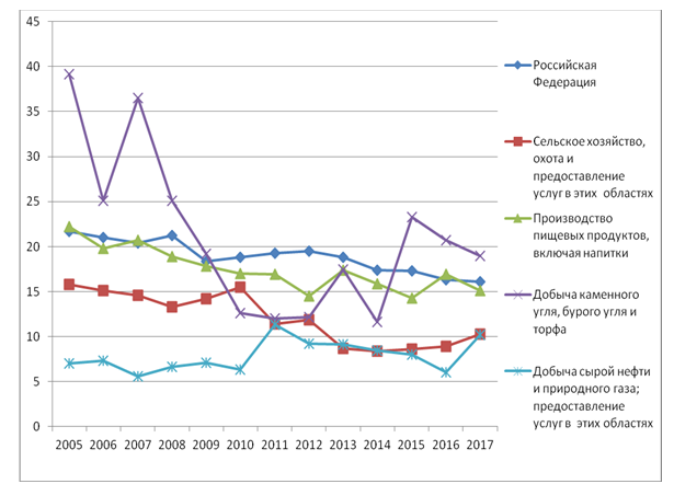 Рис. 2. Доля инвестиций, направленных на реконструкцию и модернизацию, в общем объеме инвестиций в основной капитал по видам экономической деятельности в сырьевом секторе Российской Федерации, % (2005 – 2017 г.г.)