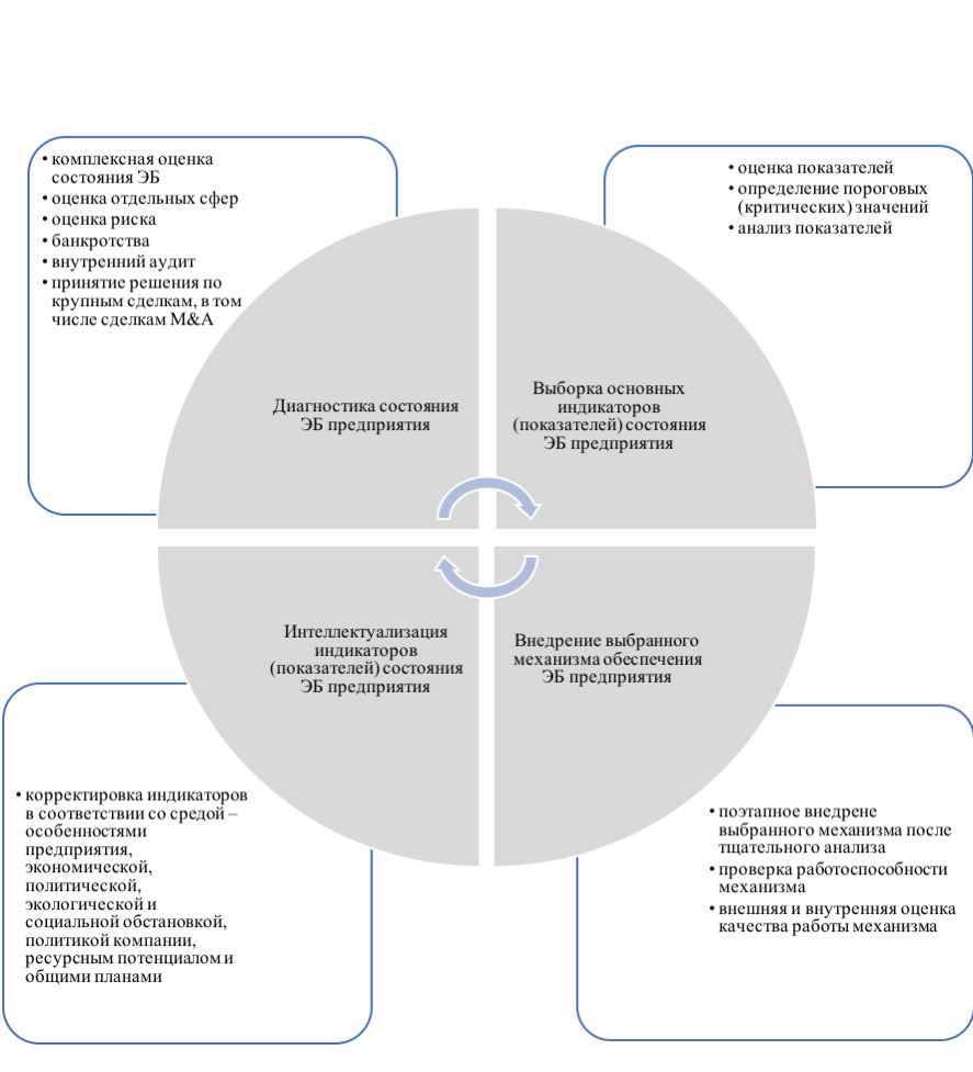 Так, механизм обеспечения экономической безопасности предприятия состоит из четырех основных этапов, благодаря которым предприятие отслеживает, диагностирует и улучшает состояние экономической безопасности, постоянно разрабатывает новые индикаторы и подходы к защите и стабильной деятельности предприятия.