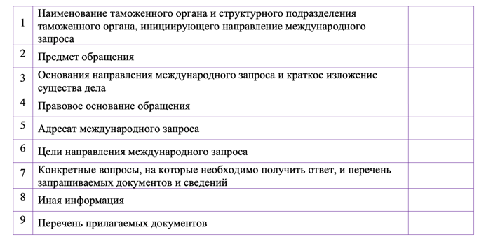 В некоторых случаях у ДЛТО возникает необходимость запроса экспортной ДТ, контракта, инвойса у уполномоченного иностранного ТО. Данный процесс осуществляется через Управление таможенного сотрудничества, запрос должен быть составлен по установленной структуре [2], представленной в таблице 1.