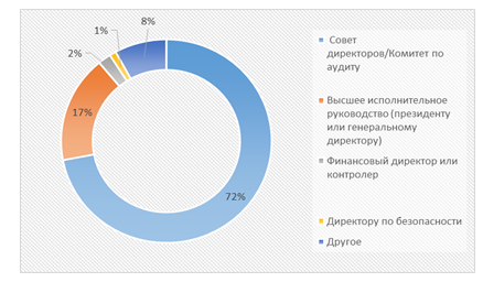 По результатам обследования американских компаний международный Институт внутренних аудиторов (The Institute of Internal Auditors) сделал вывод, что на контроль и предупреждение искажений в отчетности направлено 80% рабочего времени внутренних аудиторов, в остальное время они занимаются консультационной работой. При этом, качество внутреннего аудита определяется не только квалификацией работников, но и организационными отношениями внутренних аудиторов с потенциально рисковыми подразделениями. Вопрос независимости и подчиненности внутренних аудиторов был предметом исследования международного Института внутренних аудиторов. Результаты исследования за 2019 год показали, что 72% руководителей подразделений внутреннего аудита функционально подотчетны аудиторскому комитету при совете директоров, 17% — высшему исполнительному руководству (президенту или генеральному директору), 2% — финансовому директору или контролеру (рис.1) [1].