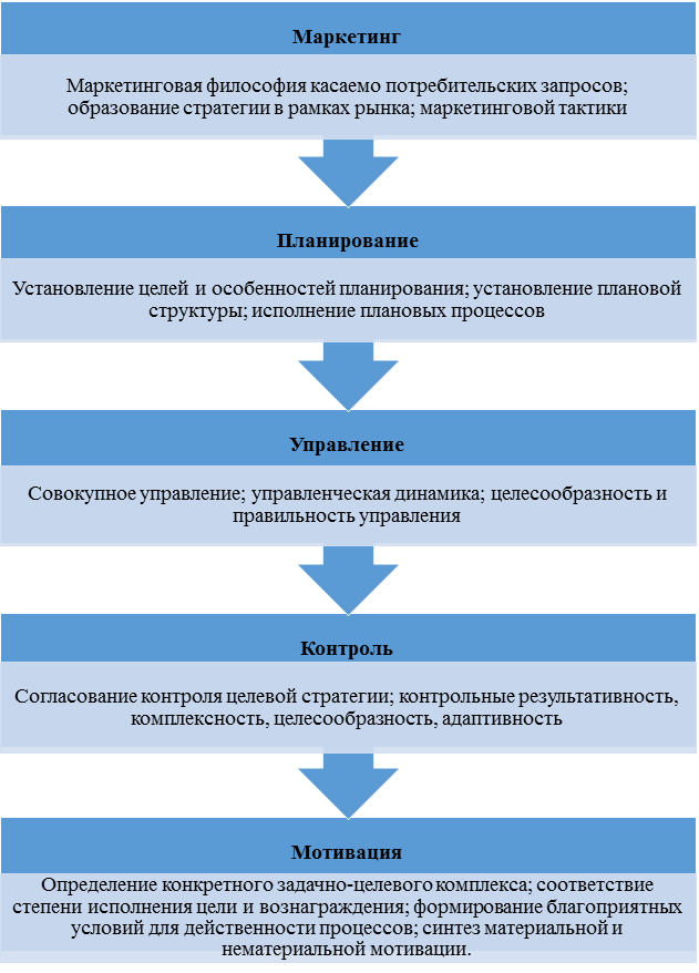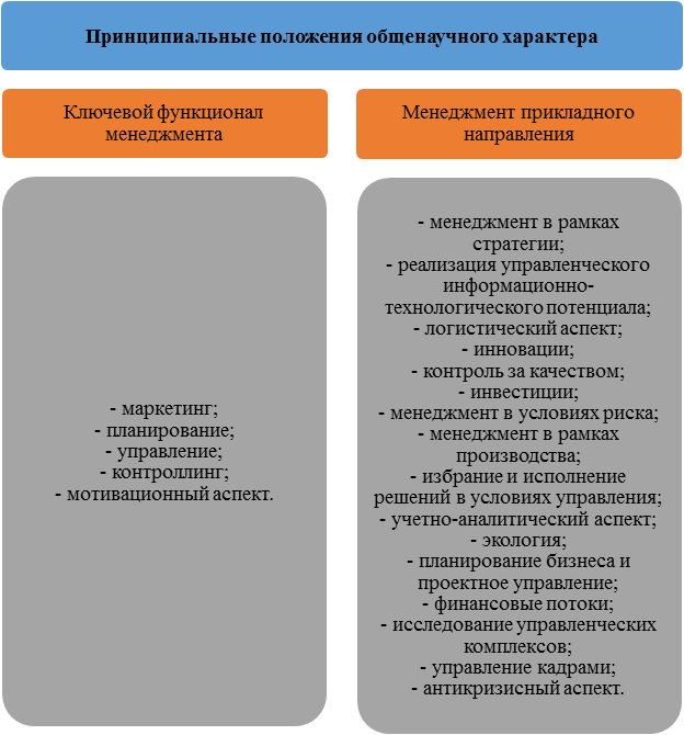 Согласно заданной тематике настоящей статьи в группе принципиальных положений менеджмента прикладного направления наибольший интерес представляет ответвление, основывающееся на стратегическом подходе – менеджмент в рамках стратегии в качества ключевого вектора развития [2].