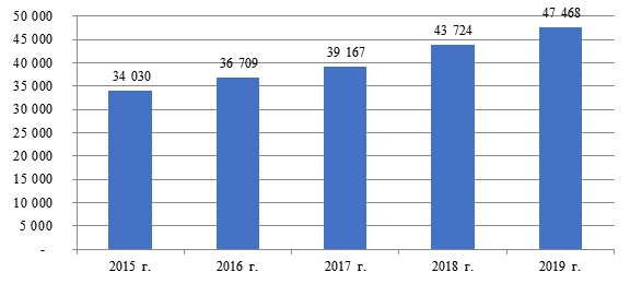 Согласно данным таблицы 1, наибольшая часть налогов, уплаченных физическими лицами, сформирована в виде НДФЛ, объем которого показывал постепенное увеличение: с 2 806 507 млн. руб. в 2015 г. до 3 955 215 млн. руб. в 2019 г. Таким образом, за пять лет рост объемов поступления налога в бюджет увеличился более чем на 40%. Главным индикатором, определяющим уплату НДФЛ, выступает объем заработной платы населения, так как от общей суммы НДФЛ, уплачиваемой в бюджет ежегодно, порядка 87% исчисляется с налоговой базы, облагаемой по ставке 13% в связи с осуществлением трудовой деятельности. На рисунке 1 показан рост объема НДФЛ сопровождался увеличением средней заработной платы в стране [15].