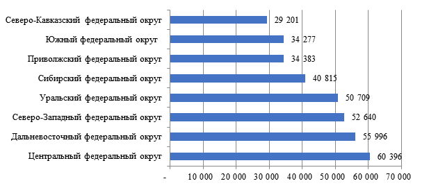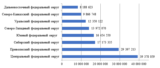 Анализ представленных данных показывает, что объем уплаты НДФЛ в г. Москве выше, чем в выбранных субъектах РФ, причем выбраны регионы с самыми крупными поступлениями налога по каждому федеральному округу. Ближе всего по объему поступлений налога к г. Москве находятся Московская область (260 998 млн. руб. в 2019 г.) и г. Санкт-Петербург (276 363 млн. руб. в 2019 г.), тем не менее у данных субъектов РФ суммы налога почти в 4 раза меньше. В других регионах объемы поступления НДФЛ ниже в 10 и даже в 30 раз, например, в Ставропольском крае по итогам 2019 г. было уплачено НДФЛ в сумме 31 628 млн. руб., что в 33 раза меньше, чем в г. Москва.