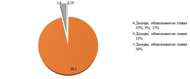 На рисунке 4 представлена структура облагаемых доходов налогоплательщиков по размерам налоговых ставок по итогам 2019 г.На протяжении 2015-2019 гг. основная часть НДФЛ исчисляется по доходам налогоплательщиков, облагаемым по основной ставке – 13%. Так, по итогам 2019 г. доля этих доходов в общей налоговой базе по НДФЛ составила 96,1% и лишь 3,6% приходится на доходы, облагаемые по ставке 30%, и 0,19% - по ставкам 35%, 9% и 15%. Источниками доходов физических лиц, облагаемых по ставке 13%, являются работодатели, признаваемые налоговыми агентами.