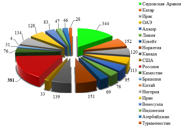 Рисунок 1 – Экспорт углеводородов (нефти и газа в целом, не включая уголь, топливо для АЭС и собственно электроэнергию, что дает еще более 100 миллионов тонн в нефтяном эквиваленте) по странам за 2019 год, миллионы тонн в нефтяном эквиваленте [1]