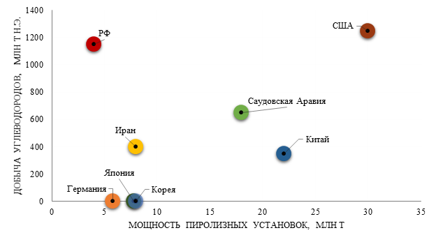 Рисунок 2 – Обеспеченность сырьем и мощность пиролизов ключевых стран-производителей нефтехимии [1]