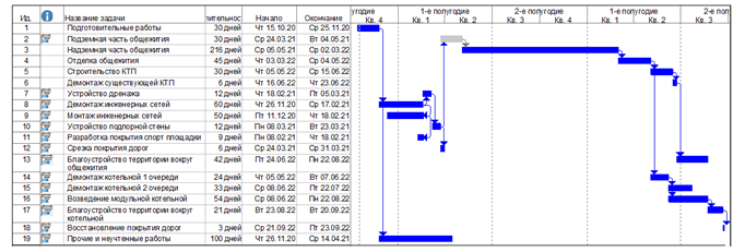 Для оптимизации календарного графика была применена поточная схема организации работ: подготовительные работы и монтаж/демонтаж инженерных коммуникаций едины для всех фронтов работ, но после возведения подпорной стены и устройства дренажа работы начинаются одновременно по строительству здания общежития и демонтажу здания котельной в два этапа (рис. 2).