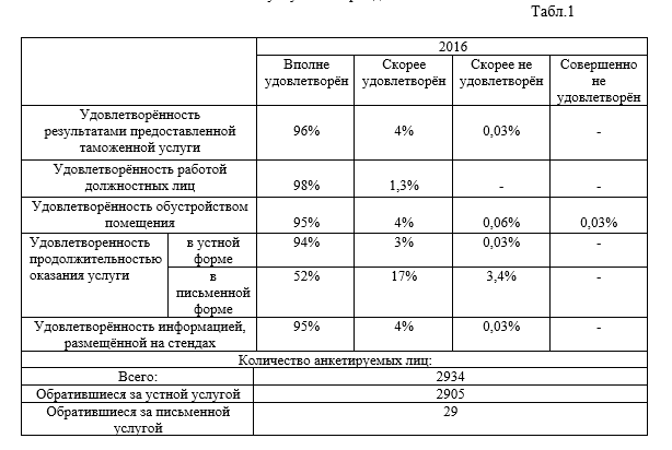 Несмотря на то, что обстановка приёмной была неблагоприятной по мнению лишь малого количества анкетируемых, по моему мнению, она всё-таки является важной составляющей при составлении человеком впечатления о предоставленной ему услуге. Важно, чтобы заявителю, среди прочих факторов, было комфортно во время консультации, для того чтобы у него сформировалась удовлетворительная оценка процесса оказания информирования или консультирования, ведь это и является основной целью предоставления услуги. Наиболее же качественной стороной деятельности, по мнению опрошенных, оказалась работа должностных лиц, что говорит об их высоком профессионализме. В целом результат реализации таможенной услуги по информированию и консультированию в 2016 году был оценён высоко.