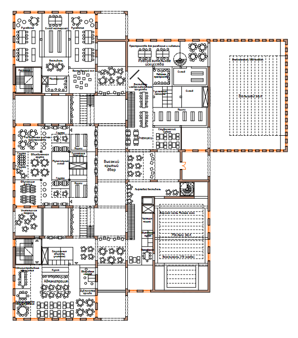 - гибкость архитектурно-планировочных решений, которая позволяет отказаться от четкого позиционирования функций помещений. Необходимы открытые рабочие зоны с возможностью трансформации пространства, различные по размеру классные комнаты (на 20 чел., на 2-10 чел., лекционные – для работы с потоком), зоны для активных игр в рекреации, коммуникативные пространства - место встреч старших и младших школьников, способствующих их социализации;