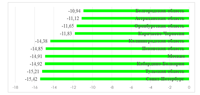 Рисунок 4 - Динамика закрытия субъектов малого предпринимательства в отдельных регионах в 2020 году.