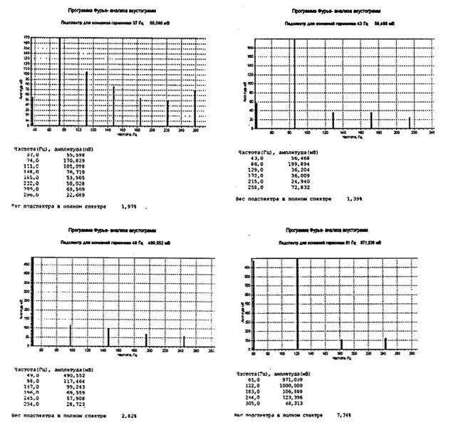 На рис.1 приведена в цифровой форме спектрограмма Фурье шестого образца и подспектры по значимым основным и кратным им тембровым гармоникам.