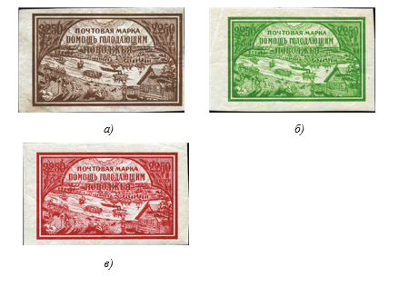 Рис. 2. Почтово-благотворительный выпуск в помощь населению Поволжья, пострадавшему от неурожая, 1921 год (декабрь). Марки, а), б), в) относятся к так называемому второму типу – стоящий на противоположном берегу Волги домик имеет закрашенную трубу