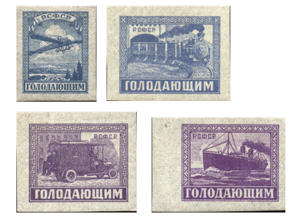 В ноябре 1922 года появились в обращении четыре миниатюры с изображениями транспортных средств доставки почты (рис. 5): автомобиля, поезда, парохода и самолета. На марках были сделаны надписи «ГОЛОДАЮЩИМ» и «Р.С.Ф.С.Р.». Продавались эти знаки почтовой оплаты по 25 рублей, из которых 20 руб. составлял почтовый доход (стоимость иногороднего письма в денежных знаках образца 1922 г.), а 5 руб. отчислялись в фонд борьбы с последствиями неурожая. И хотя на этих марках не обозначен номинал, они являются подлинно почтовым выпуском. Идея работников Наркомпочтеля о выпуске безвалютных знаков почтовой оплаты с постоянным рисунком (что удешевляло бы выпуск почтовых марок), но с последующей переоценкой, к счастью филателистов, не была реализована.