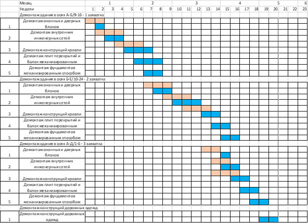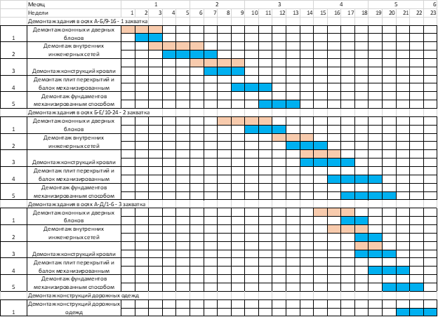 Технологический процесс демонтажа является неотъемлемой строительной операцией подготовки строительной площадки. Рассмотренный календарный график демонтажных работ с учётом стесненных условий сокращает продолжительность