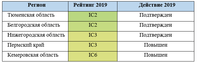В рейтинге 2019 года 24 региона формируют группу с высокой инвестиционной привлекательностью (группы IC1, IC2, IC3), наибольшее количество (35) регионов имеют среднюю инвестиционную привлекательность (группы IC4, IC5, IC6), а инвестиционная привлекательность 26 регионов оценивается как умеренная (группы IC7, IC8, IC9).