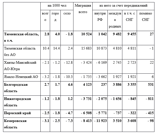 В Тюменской области миграционный прирост имеет самые высокие значения, причем из стран постсоветского пространства в регион едет в 9 раз больше мигрантов, чем из российских регионов. Миграционный прирост Белгородской области также достаточно высок, абсолютное большинство (99,5%) миграционного потока в регион происходит за счет украинских граждан. Нижегородскую область в 2019 году покинуло 3731 человек; Пермский край – 6508 человек, 99% из которых россияне; Кемеровскую область – 8413 человек, этот регион имеет самый низкий коэффициент миграционного прироста (-3,1).