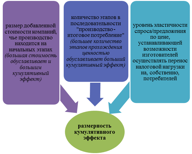 При этом, ввиду обложения налогом с оборота совокупного валового оборота, имеет место кумулятивный эффект, выступающий начислением данного налога, включающим такую стоимость, которая добавлена как на текущем, так и на предшествующих этапах, которые ранее облагались налогом [6].