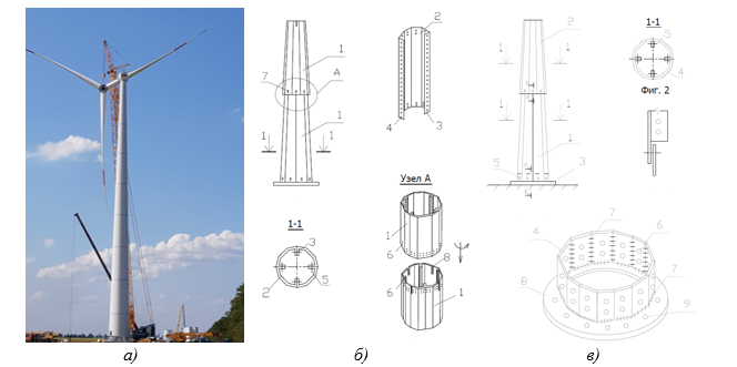Рисунок 1 – Конструкция башни ветроэлектрической установки а) общий вид ВЭУ Acciona AW-82-1500 класса IEC IIIB; б) новая конструкция телескопического стыка (патент РФ № 2743116); новая конструкция базы (патент РФ № 2743980)