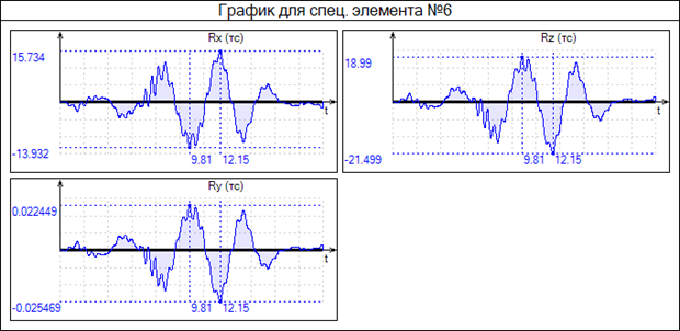 Общие результаты расчета для опорного узла приведены на рисунке 7. Дополнительно на рисунке 8 представлены графики внутренних усилий в фундаментных болтах в период сейсмического воздействия.