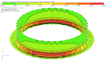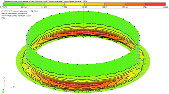Для иллюстрации полученных результатов на рисунках 8-11 приведены распределения интенсивности напряжений по Мизесу для варианта расчета от особого сочетания. Интенсивность напряжений по Мизесу вычисляется по формуле: ![]()