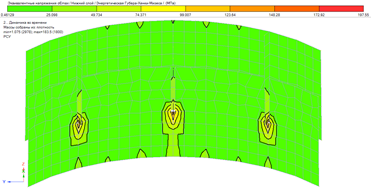 Рисунок 11 - Изополя эквивалентных напряжений Вон Мизеса по нижней грани пластинчатых конечных элементов телескопического узла стыка
