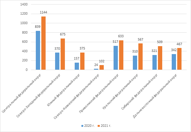 Рисунок 2. Количество социальных предприятий в федеральных округах Российской Федерации в 2020 – 2021 г.г.